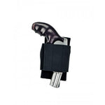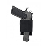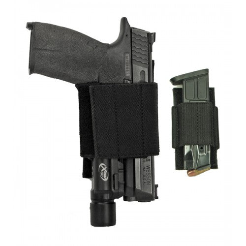 A hook & loop removable wrap Holster plus three (3) accessory holders. The wrap holster is made out of two (2) layers of milspec elastic webbing compared to the single layer that is found in other holsters. The accessory holders are also double layered and can hold a variety of items from double magazines (1 each), single stacks (2 in each), flashlights to multi-tools, etc.